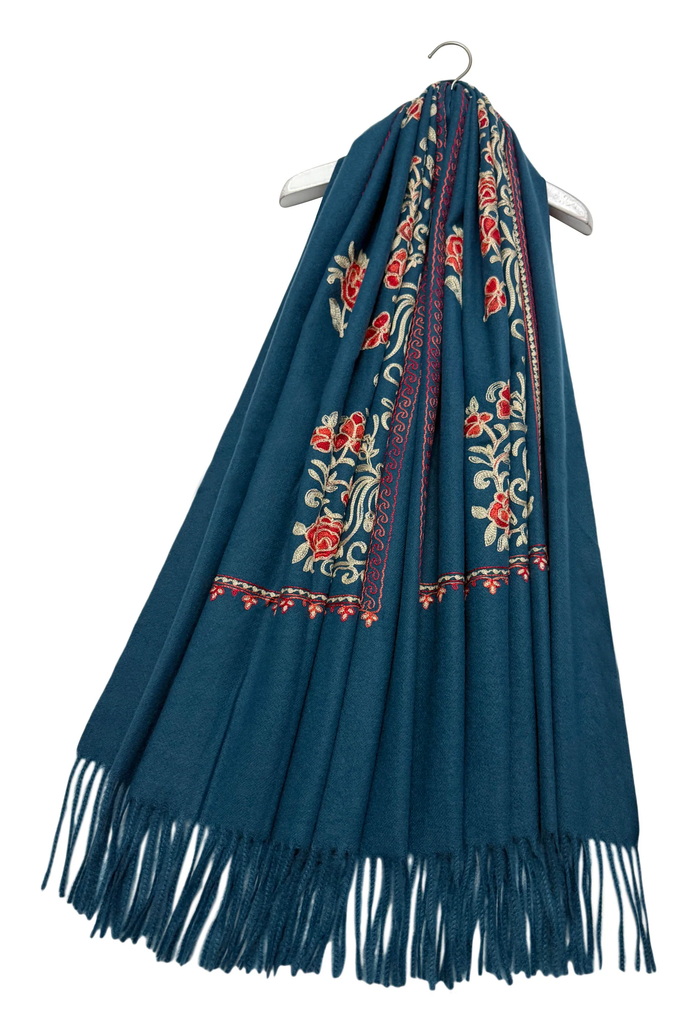 Bold Embroidered Floral Shawl-Scarf - Blue