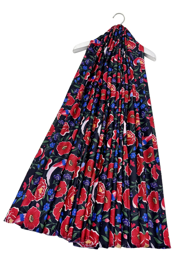 A soft and warm poppy design, one-sided scarf with contrasting reverse back that can also be used as a Shawl or Pashmina Wrap. Inspired by the botanical style of William Morris.