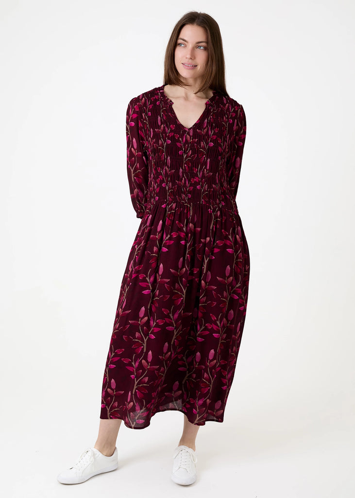 A very feminine and floaty long dress adorned with a delicate vine print that brings soft elegance to any occasion. This dress combines ease and style and the gently gathered detailing adds graceful movement.