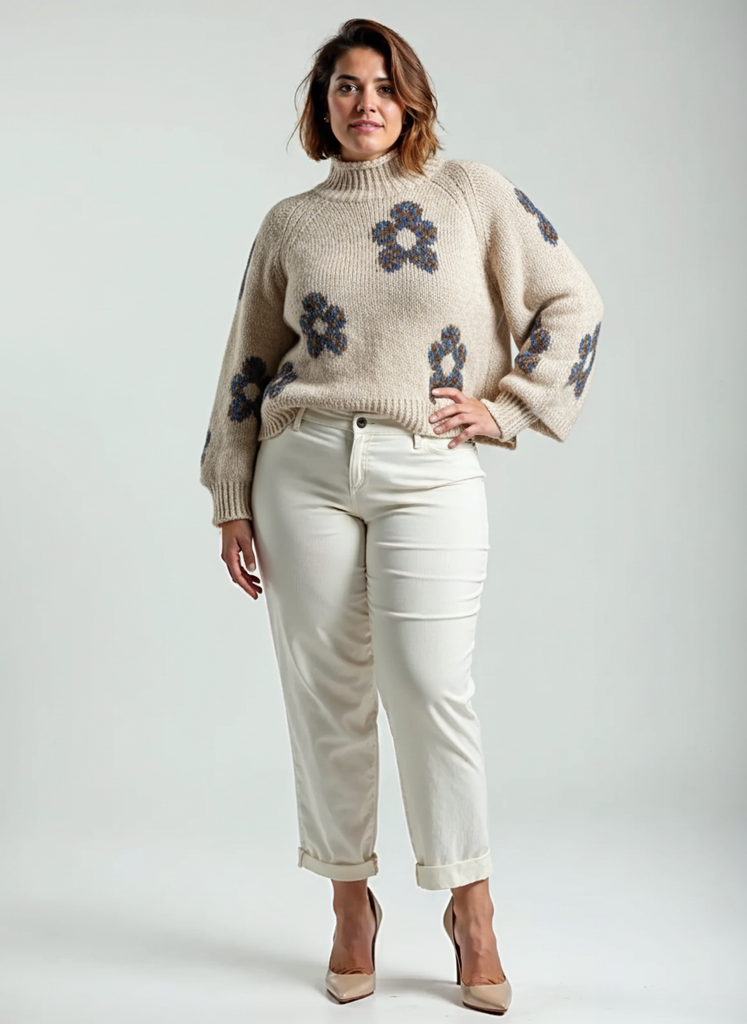 A lovely cosy knit that goes well with casual jeans or a dressy skirt - a hand-crafted look that stands out from the usual high-street knitwear.