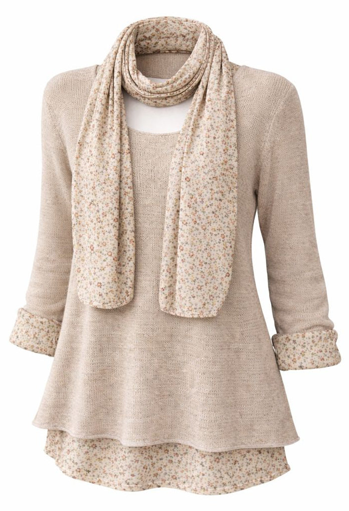 Knitted Layer Top with Scarf - Beige
